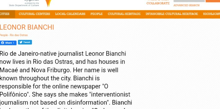 Leonor Bianchi Há mais de duas décadas militando no segmento cultural, fui convidada a integrar o Mapa de Cultura do Estado do Rio de Janeiro em 2012, quando foi criado. O Mapa traz um verbete (abaixo) desatualizado. De 2012 até hoje já criei dezenas de outras ações culturais, dentre elas, a própria Revista do Choro … Continue a ler Há mais de duas décadas militando no segmento cultural, editora da Revista do Choro, Leonor Bianchi, integra o Mapa de Cultura do Estado do Rio de Janeiro desde 2012