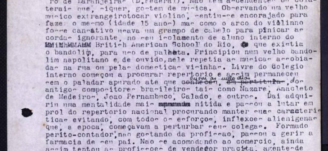 No ambiente virtual, o MIS disponibiliza, a partir de hoje, um documento inédito, achado em meio ao acervo da casa de mais de 350 mil itens. São duas folhas datilografadas por Jacob do Bandolim nas quais o músico faz um relato autobiográfico, contando um pouco de sua história. O texto ganhou vídeo encenado e locução que está disponível a partir de hoje na Rádio MIS (radiomisrj.com.br).