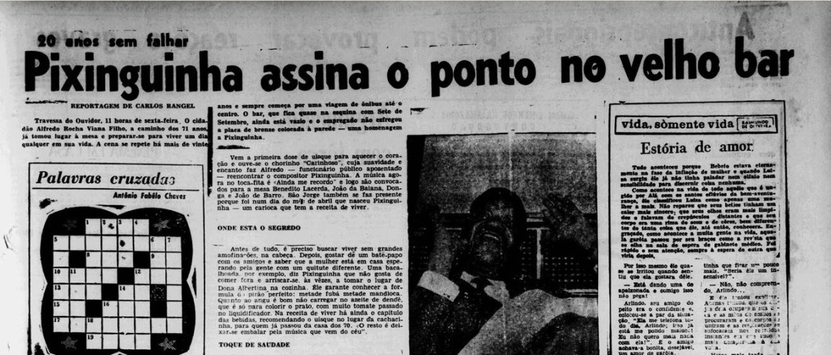 Pixinguinha não sabe porque escolheu a Travessa do Ouvidor para refúgio. Recorda o bom Gouveia e o armazém que ali existiu com um balcão movimentado e conversa interminável antes de voltar para casa. Só depois deram o nome de uisqueria. Mesmo sem nada o que fazer no centro da cidade, ele não deixa de comparecer diariamente, exceto aos domingos.já não traz a flauta nem o saxofone porque vem apenas para bebericar e “trocar idéias” com os amigos. Uma coisa que o carioca está desaprendendo – frisa Pixinguinha após lembrar de outro bar que existiu nas imediações. No andar de cima era o escritório da RCA Victor, de quem ele foi por muito tempo contratado. Foi ali que conheceu Jacob e seu bandolim, além do chefe de orquestra Napoleão e seu Pistão. O grupo não era só formado por músicos, como não o é até hoje. Havia também embaixadores, dois ou três generais e até um conde. Hoje, ainda surgem de vez em quando, para pedir-lhe a benção, no mesmo lugar, Chico Buarque, Tom Jobim e Elisete Cardoso.