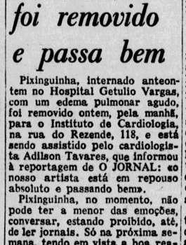 Pesquisa Leonor Bianchi   . . . This content is restricted to subscribers PIXINGUINHA FOI REMOVIDO E PASSA BEMThis entry was posted in Hemeroteca Digital do Choro PIXINGUINHA 1960 PIXINGUINHA ANOS 1960 on 07/07/2023 by imprensabr