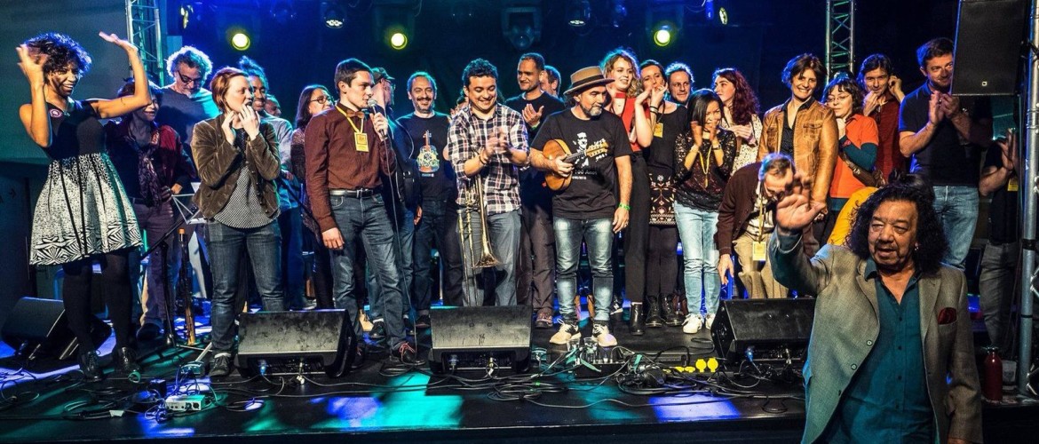 Foto: Noite de encerramento da primeira edição do Lille Choro Festival, ano passado, com Raul de Souza, padrinho do festival (à direita), e todos os músicos e voluntários que ajudaram na sua organização.